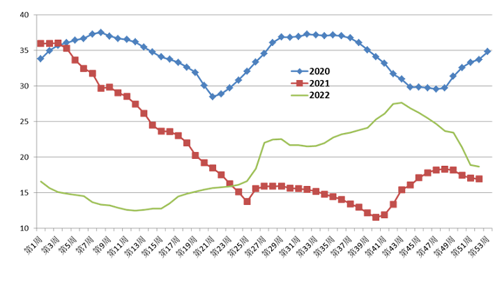2020-2022年生豬周價格走勢(元/公斤)