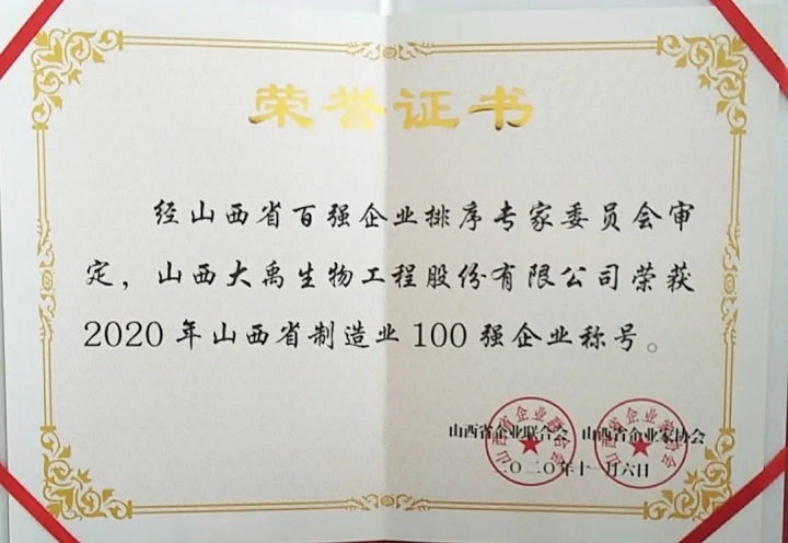 大禹生物榮獲山西省制造行業100強榮譽稱號。
